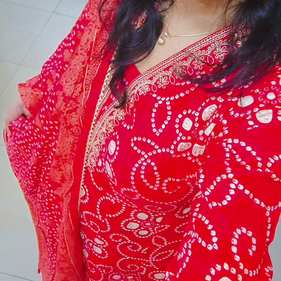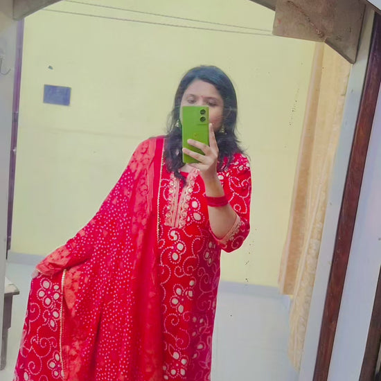 Turn heads this Navratri and festivals with our Red Ethnic Motif Anarkali Kurta Set, crafted in soft rayon fabric for all-day comfort and grace. 🌺 This full-length, flowy Anarkali features gota borders, intricate prints all over, and 3/4th sleeves for a timeless festive look. Paired with a rich gold-printed dupatta and tassel tie-ups, this piece is perfect for Garba nights, festive celebrations, and wedding events.