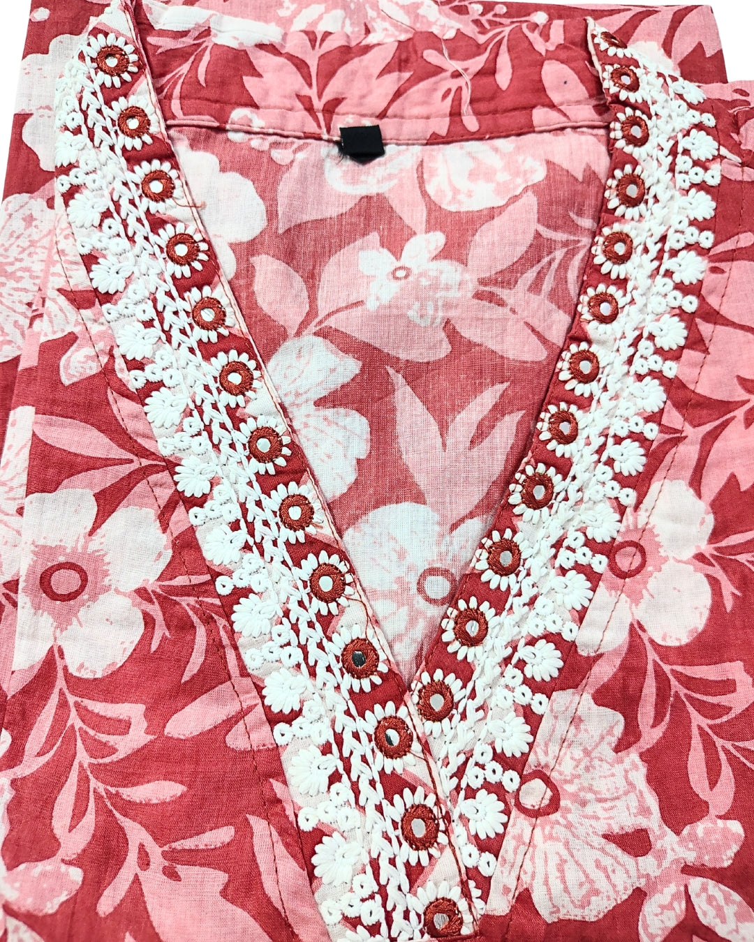 Embrace timeless elegance with our Rust Blossom Kurta Set, crafted in soft premium cotton for unbeatable comfort and grace. This straight kurta features a stunning floral print in soothing shades of rust and blush, delicately accented with intricate white daisy-thread embroidery on the neckline — adding a touch of charm to every step you take.