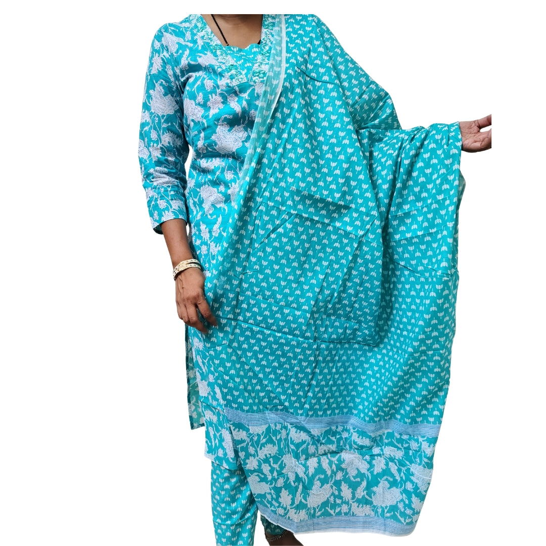 The kurta features a soothing sea green shade with elegant white floral prints, complemented by a relaxed-fit printed bottom and a matching dupatta. The soft texture and lightness of the fabric make it perfect for everyday elegance — without compromising on comfort or style.